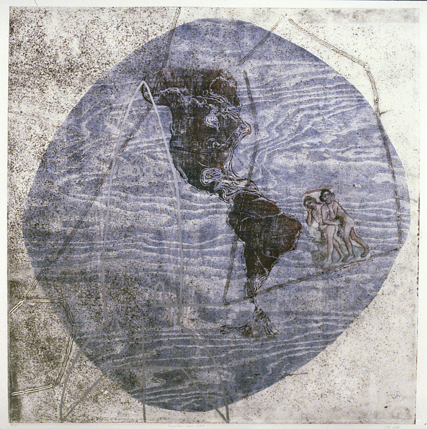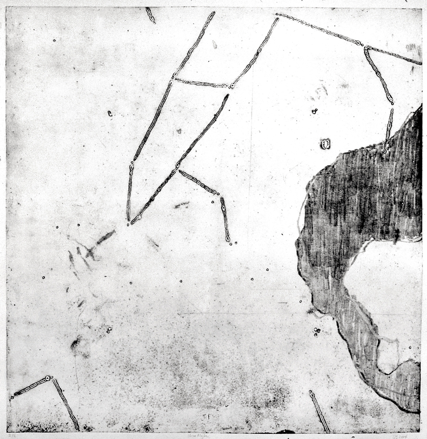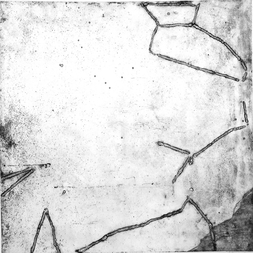 Prints from Steel plates and plywood. In this installation I used printmaking as a metaphor for our search for meaning in the universe. Prints, as possible answers to hypothetical questions; a call and response. Through a long process involving my car, I took 2 intaglio prints from each of the twelve steel plates (4x4 ft) that had been prepared with images of the constellations as part of a sculptural installation. It struck me as appropriate that the force used in intaglio printing, compression, was the conceptual beginning of that project. Of the two prints, I developed one further with multiple layers of relief printing and mixed-media. The first print spoke to the information gathered, and the second became how we interpret that knowledge.