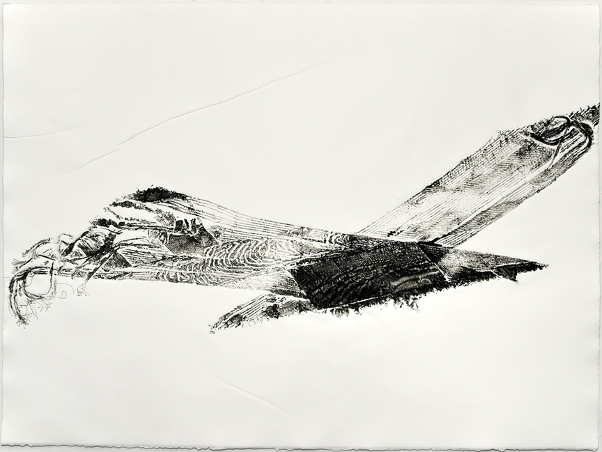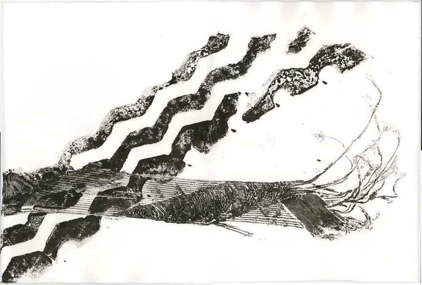 These prints run parallel to my tire sculptures. Through printing I am re-animating the tire, capturing an echo of it driving on the road leaving its imprint on the environment. I used two different printing methods, intaglio and relief. Intaglio by running the inked tire fragments through an etching press or running over them with a “steam-roller”. I did the 60-foot relief print manually.