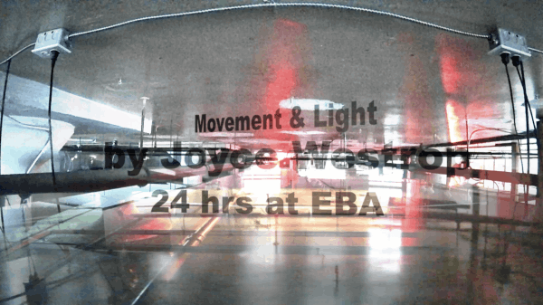 This video compresses a 24-hour timespan at EBA into an abstraction of shifting colours and light. The work was created from hours and hours of time lapse footage from two surveillance cameras pointed 180 degrees from each other. The footage was then flipped and layered to incorporate an abstracted 100% view of the ceiling over the same time period.